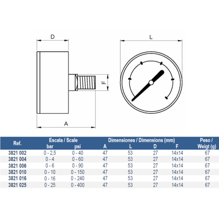 GENEBRE PRESSURE GAUGE 10 BAR 50mm FACE 8mm BACK INLET 3821 010