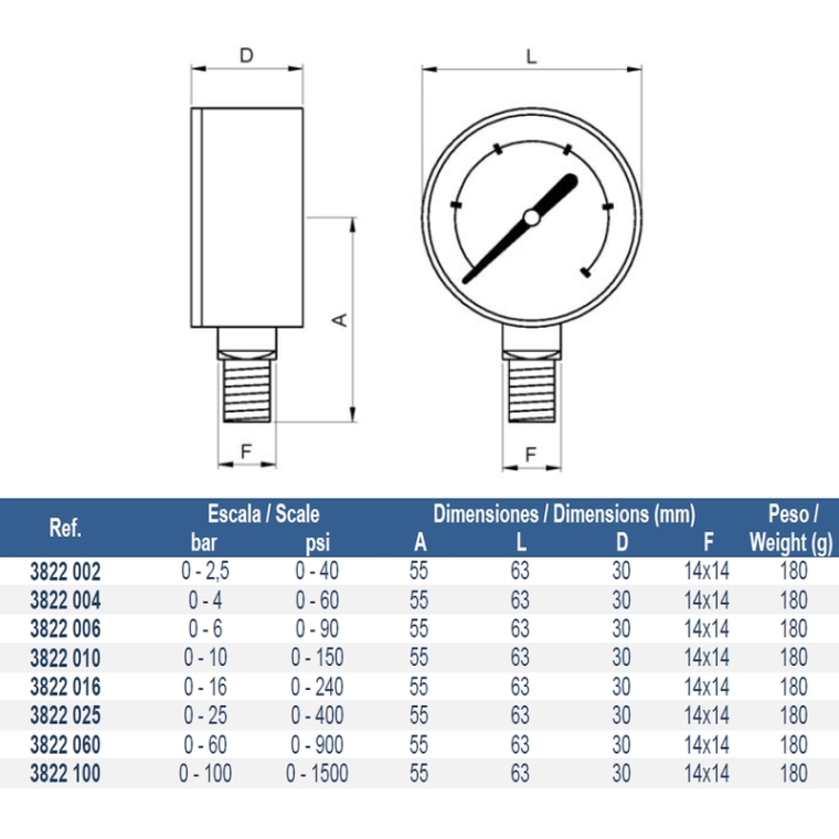GENEBRE PRESSURE GAUGE 25 BAR 63mm FACE 8mm BOTTOM INLET 3822 025