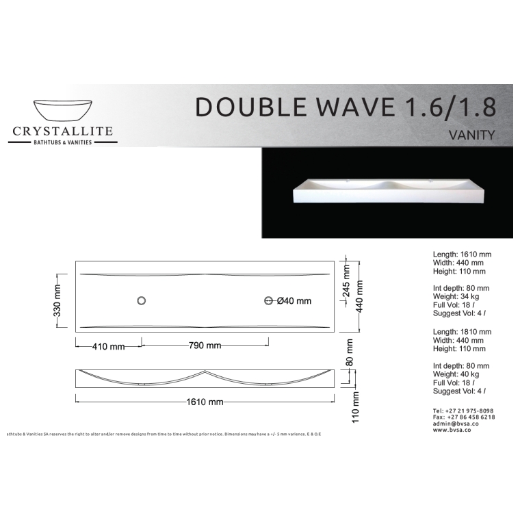 CRYSTALLITE DOUBLE WAVE VANITY BASIN 1.6 WHITE 1610x440x110